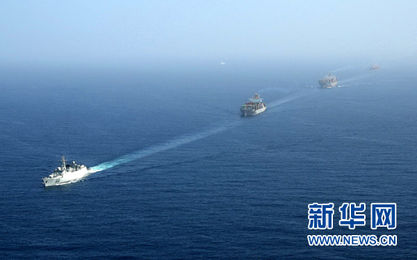 2009年1月6日,在中國海軍護(hù)航艦艇編隊武漢號導(dǎo)彈驅(qū)逐艦的帶領(lǐng)下,被護(hù)航的中國商船一字排開航行。 2009年4月28日,中國人民解放軍海軍第一批赴亞丁灣護(hù)航編隊,圓滿完成護(hù)航任務(wù)后返回海南三亞某軍港。由武漢號導(dǎo)彈驅(qū)逐艦、海口號導(dǎo)彈驅(qū)逐艦和微山湖號綜合補給艦組成的海軍首批護(hù)航編隊,在124個日夜里連續(xù)航行33000多海里,為41批166艘船舶實施了伴隨護(hù)航,為46艘船舶提供了區(qū)域護(hù)航,成功救援了3艘遇襲外國船只,安全、順利、圓滿地完成了護(hù)航任務(wù)。新華社發(fā)