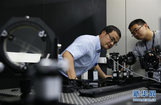 在上海張江國(guó)家科學(xué)中心,冷用斌(左)和同事在上海光源同步光診斷實(shí)驗(yàn)室內(nèi)做實(shí)驗(yàn)(2015年5月27日攝)。新華社記者 裴鑫 攝