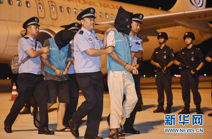 2017年8月24日,在成都雙流國際機場,122名跨國電信詐騙案件犯罪嫌疑人從柬埔寨被統一押解回國。新華社記者 吳光于 攝