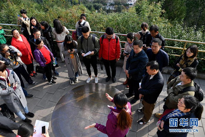 10月12日,記者團(tuán)在景山公園北京城中心點(diǎn)參觀。新華社記者 李鑫 攝