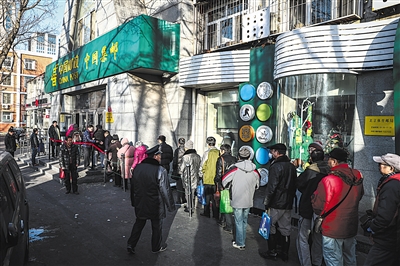 中國(guó)郵政工體北路郵政支局門口,市民排隊(duì)購(gòu)買郵票。