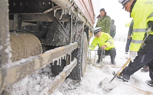 1月4日,湖北襄陽民警在臥龍大橋上幫助車主安裝防滑鏈。1月3日夜里至4日,湖北襄陽、十堰普降大雪。襄陽各職能部門預(yù)先謀劃,全力應(yīng)對雨雪天氣給道路通行安全帶來的不利影響。王虎 攝