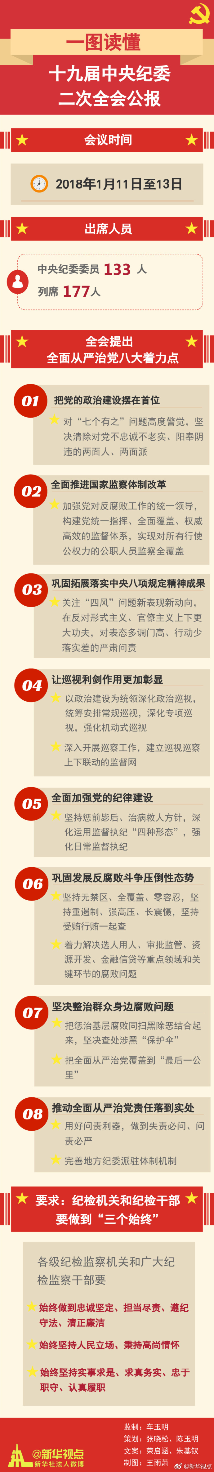 新華網(wǎng)北京1月13日電 13日審議通過(guò)的十九屆中央紀(jì)委二次全會(huì)公報(bào)新鮮出爐。想知道全面從嚴(yán)治黨如何發(fā)力?有這張圖在手,重點(diǎn)、亮點(diǎn)、焦點(diǎn)你都擁有!(據(jù)“新華視點(diǎn)”微博報(bào)道)