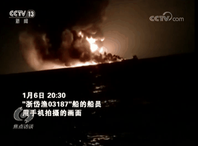 1月14日12點30分,“桑吉”輪突然猛烈燃燒,火焰最高達1000米,船體開始下沉。16點45分,“桑吉”輪沉沒。