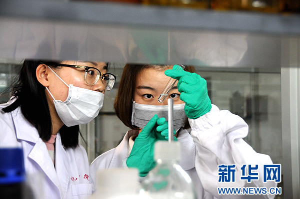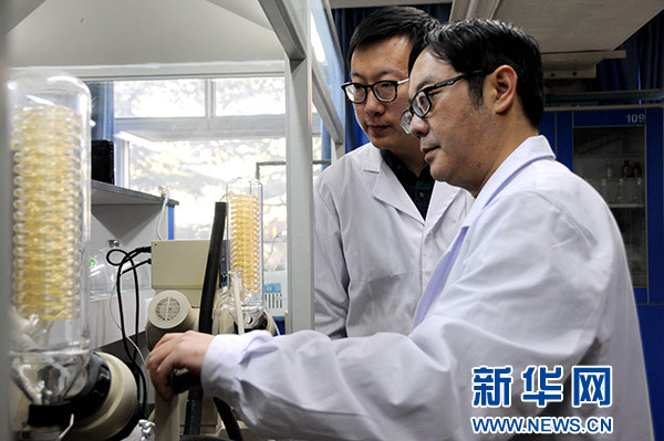1月19日,蘭州交通大學(xué)天然藥物開發(fā)研究所教授沈彤(右)和他的學(xué)生一同進(jìn)行生物農(nóng)藥試驗。新華社發(fā)(王銘禹 攝)