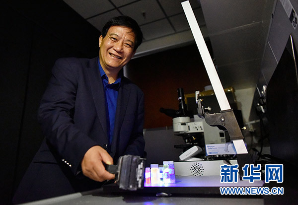 1月18日,唐本忠在向記者展示聚集誘導發光材料。新華社發 (王璽 攝)