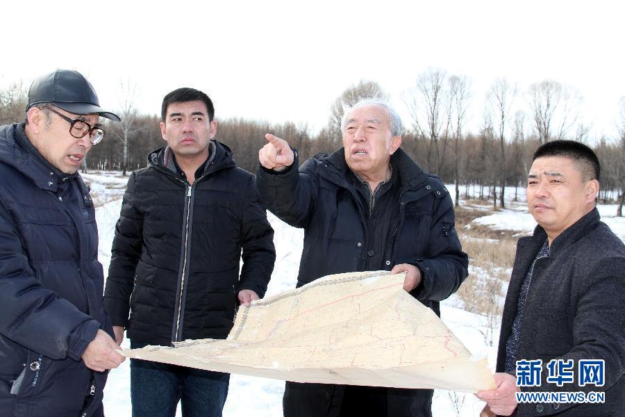 2016年3月14日,王樹清(右二)在黑龍江省拜泉縣國富鎮通肯村和當地干部規劃植樹造林。新華社發