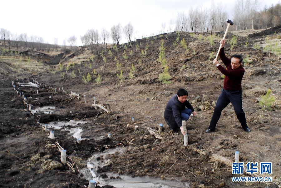 2009年11月30日,在黑龍江省齊齊哈爾市拜泉縣,王樹清(左)在檢查樹苗情況。新華社發