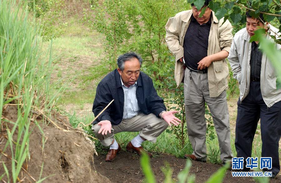 2002年5月30日,在黑龍江省齊齊哈爾市拜泉縣,王樹清(左一)在檢查植樹造林情況。新華社發