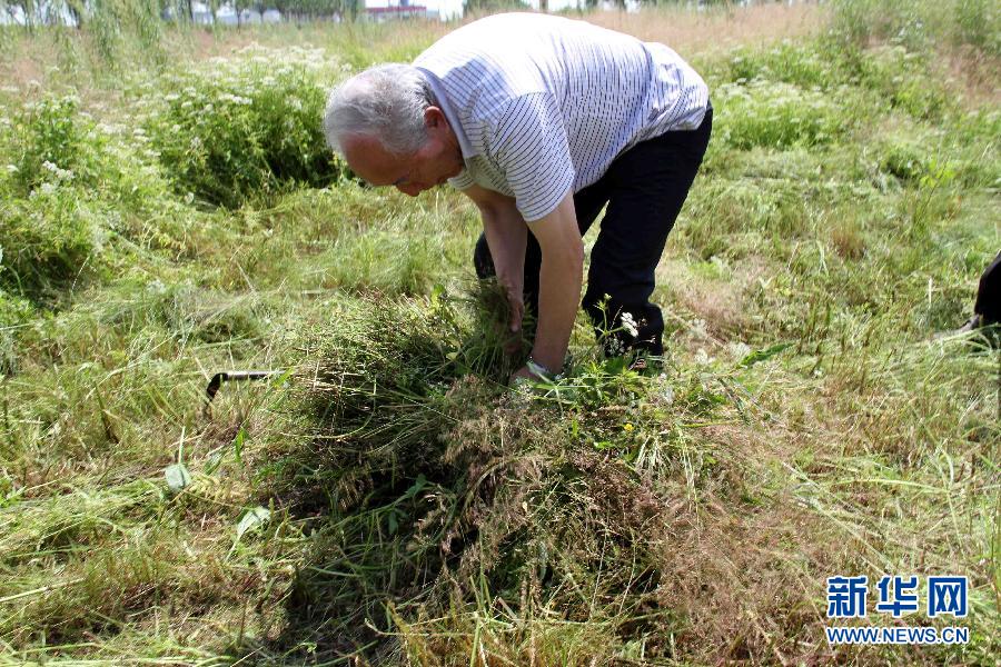 2016年8月1日,在黑龍江省齊齊哈爾市拜泉縣城西濕地,王樹清在幫養畜戶打飼草、捆草。新華社發