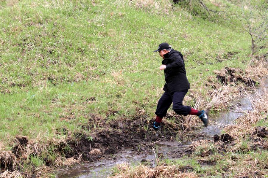 2016年5月25日,王樹清在黑龍江省拜泉縣國富鎮愛護村查看造林地塊時跳過一條水溝。新華社發