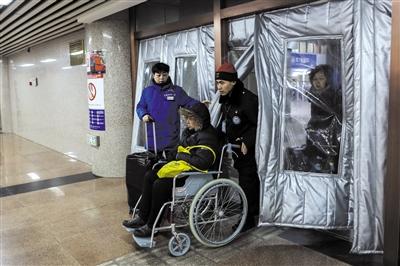 2月11日晚7時,北京西站一個小服務臺前,背后印有“愛心驛站”四個字的志愿者郭曉瀟聽到對講機的緊急呼叫,嫻熟地推過一旁的輪椅,一路小跑朝著退票處前進,愛心驛站班長張曉京也帶上一名志愿者緊隨其后。