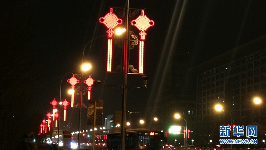 2018年2月13日,長安街兩旁的燈柱整齊地掛滿了象征吉祥福瑞的中國結(jié)。新華網(wǎng) 張明宇 攝