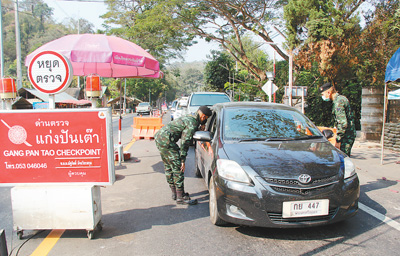 在距離泰緬邊境約40公里的格班丹檢查站,幾名警察在細(xì)致地檢查一輛越野車(chē),緝毒犬也跳上車(chē)子,把車(chē)輛內(nèi)外嗅了個(gè)遍。檢查站旁沙袋堆壘的掩體內(nèi),全副武裝的士兵警惕地注視著周邊茂密的叢林。