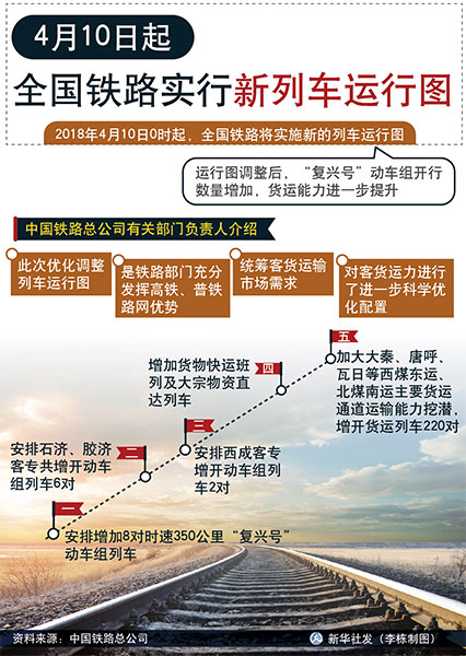 2018年4月10日0時起,全國鐵路將實施新的列車運行圖。運行圖調(diào)整后,“復(fù)興號”動車組開行數(shù)量增加,貨運能力進一步提升。新圖實施后,北京至上海間通過壓縮停站,實現(xiàn)最快4小時18分可達,較調(diào)圖前壓縮6分鐘。>>>