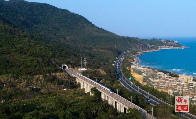 藍天碧海,文昌航天發射場箭指太空,三亞國際郵輪港碼頭萬噸郵輪矗立,環島高鐵火車飛馳……
