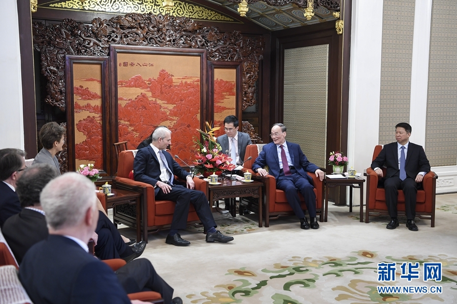 4月11日,國(guó)家副主席王岐山在北京中南海會(huì)見英國(guó)內(nèi)閣辦公廳大臣利丁頓率領(lǐng)的第十屆中英政黨對(duì)話英方代表團(tuán)。 新華社記者 張領(lǐng) 攝