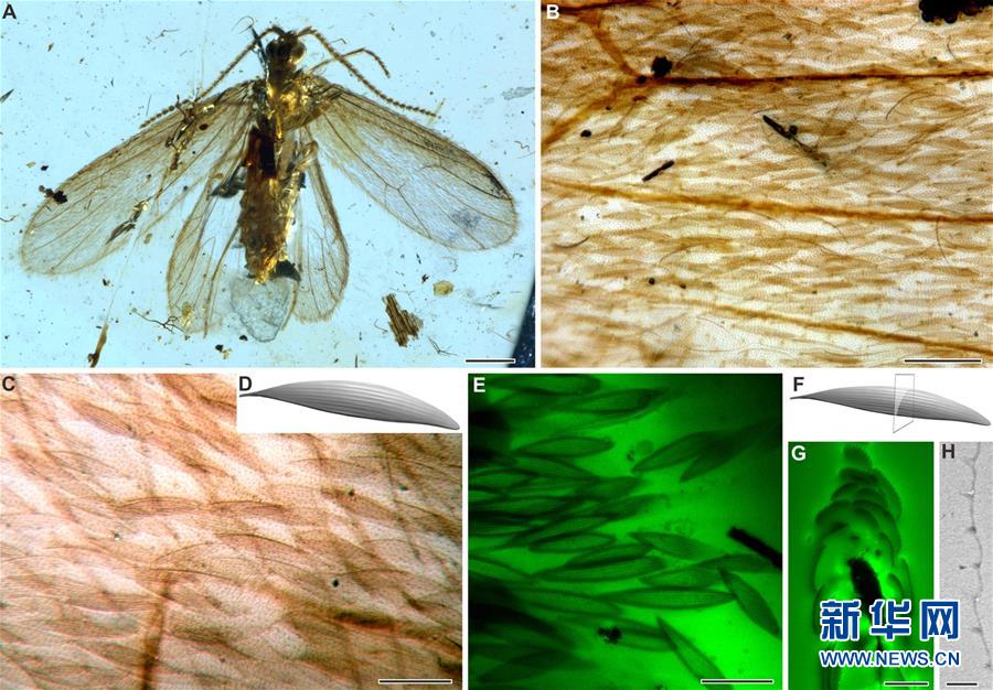 緬甸琥珀中飄翅目昆蟲及其鱗片結構的圖片。新華社發(中國科學院南京地質古生物研究所提供)