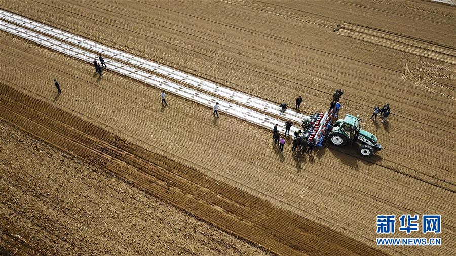 在新疆庫車縣牙哈鎮的一處棉田,“智能拖拉機”在進行播種作業(3月23日無人機拍攝)。國家統計局4月17日發布數據,初步核算,一季度國內生產總值198783億元,按可比價格計算,同比增長6.8%。 新華社記者 胡虎虎 攝