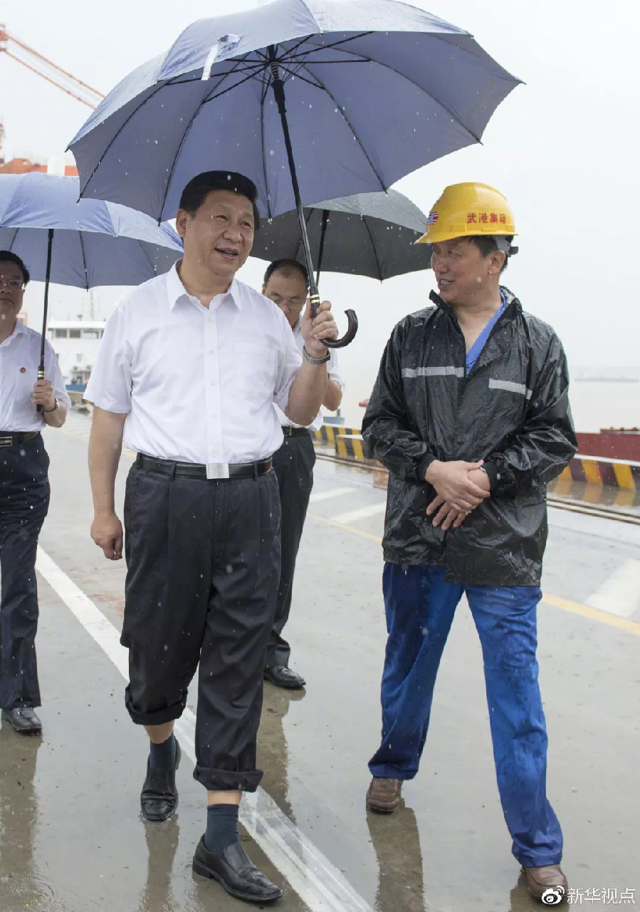 荊楚大地,江河縱橫。2013年7月21日上午,習近平冒著大雨前往武漢新港陽邏集裝箱港區,卷起褲腿,打著雨傘,趟著積水,了解港口貨物吞吐量情況。他強調,長江流域要加強合作,充分發揮內河航運作用,發展江海聯運,把全流域打造成黃金水道。