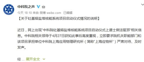 近日,網(wǎng)上出現(xiàn)“中科院釷基熔鹽堆核能系統(tǒng)項(xiàng)目啟動(dòng)儀式上道士做法驅(qū)邪”相關(guān)信息。中科院相關(guān)領(lǐng)導(dǎo)于4月27日獲知此事后高度重視,立即要求院機(jī)關(guān)職能部門和該項(xiàng)目承擔(dān)單位中科院上海應(yīng)用物理研究所(簡(jiǎn)稱“上海應(yīng)物所”)嚴(yán)肅對(duì)待、及時(shí)發(fā)聲。