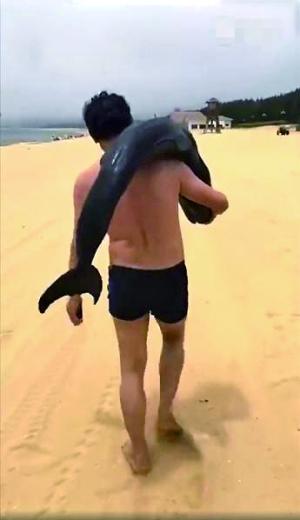 昨天,網(wǎng)絡(luò)流傳的多段視頻顯示,一名身穿泳衣的男子疑似背上扛著一只海豚在沙灘行走(見圖)。多位網(wǎng)友回復(fù)稱,該事件發(fā)生于廣東陽江市海陵島沙灘附近,涉事男子直接把海豚扛走。