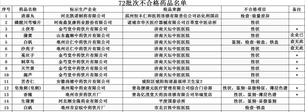 山東省食藥監局今天發布第5期藥品、中藥飲片抽檢結果,72批次藥品質量抽檢不合格。