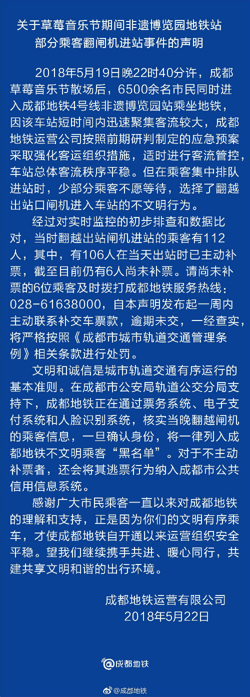 5月22日,成都地鐵發(fā)布“關(guān)于草莓音樂節(jié)期間非遺博覽園地鐵站部分乘客翻閘機進站事件的聲明”(以下簡稱“聲明”),稱,5月19日晚草莓音樂節(jié)散場后翻越地鐵4號線非遺博覽園站出站閘機進站的乘客112人中,尚有6人尚未補票?!奥暶鳌卑l(fā)布起一周內(nèi),希望他們主動聯(lián)系補交車票款,逾期未交,一經(jīng)查實,將嚴格按照《成都市城市軌道交通管理條例》相關(guān)條款進行處罰。