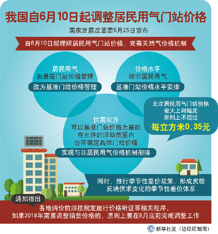 國(guó)家發(fā)展改革委5月25日宣布,自6月10日起理順居民用氣門站價(jià)格、完善價(jià)格機(jī)制。這是我國(guó)自2010年以來(lái)首次調(diào)整居民用氣門站價(jià)格,最大上調(diào)幅度原則上不超過(guò)每立方米0.35元。