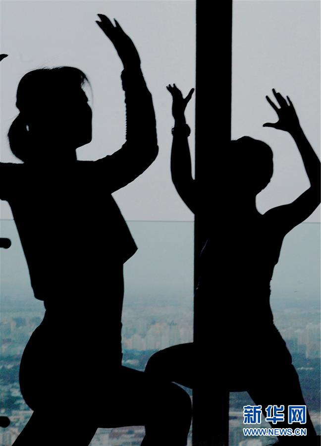 當日,數(shù)名瑜伽愛好者在專業(yè)瑜伽教練的帶領下在北京國貿(mào)大酒店70層以上的高樓層練習瑜伽,體驗高空練習瑜伽的樂趣。