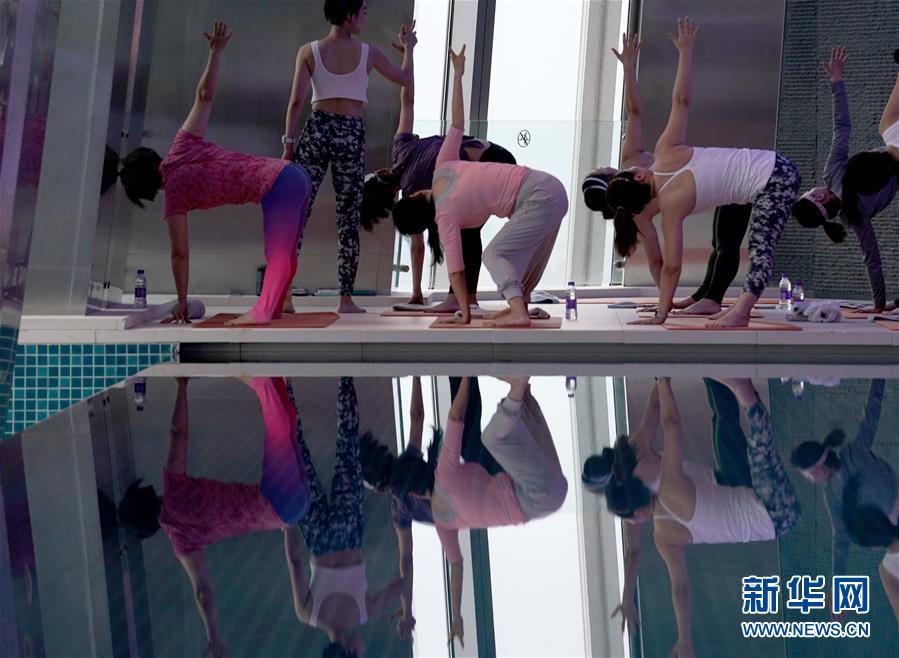 6月9日,在北京國(guó)貿(mào)大酒店78層游泳館,瑜伽愛(ài)好者練習(xí)瑜伽。