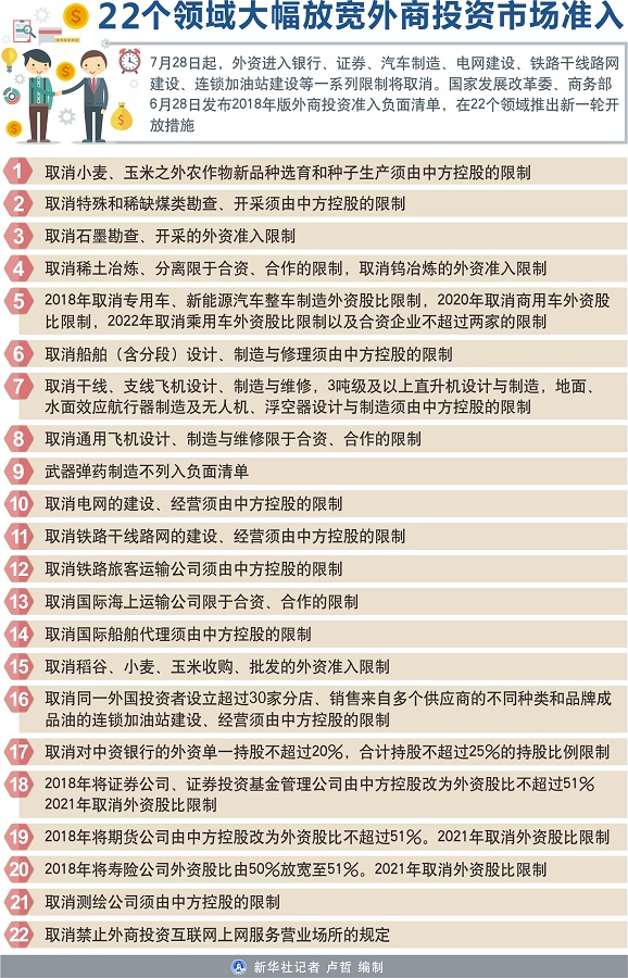 新華社北京6月28日電(記者安蓓、陳煒偉)7月28日起,外資進入銀行、證券、汽車制造、電網(wǎng)建設、鐵路干線路網(wǎng)建設、連鎖加油站建設等一系列限制將取消。國家發(fā)展改革委、商務部28日發(fā)布2018年版外商投資準入負面清單,在22個領域推出新一輪開放措施。
