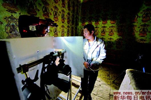 ▲工作人員對莫高窟第152窟進行數字化采集。 攝影:本報記者陳斌