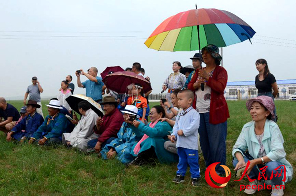 牧民們席地而坐觀看演出。人民網 賀茂杰 攝