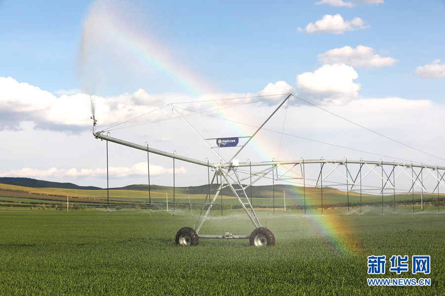 6月23日,在內(nèi)蒙古呼倫貝爾墾區(qū)蘇沁農(nóng)牧場的小麥地里,一輛平移式噴灌機正在田里進行噴灌作業(yè)。(內(nèi)蒙古呼倫貝爾農(nóng)墾供圖)
