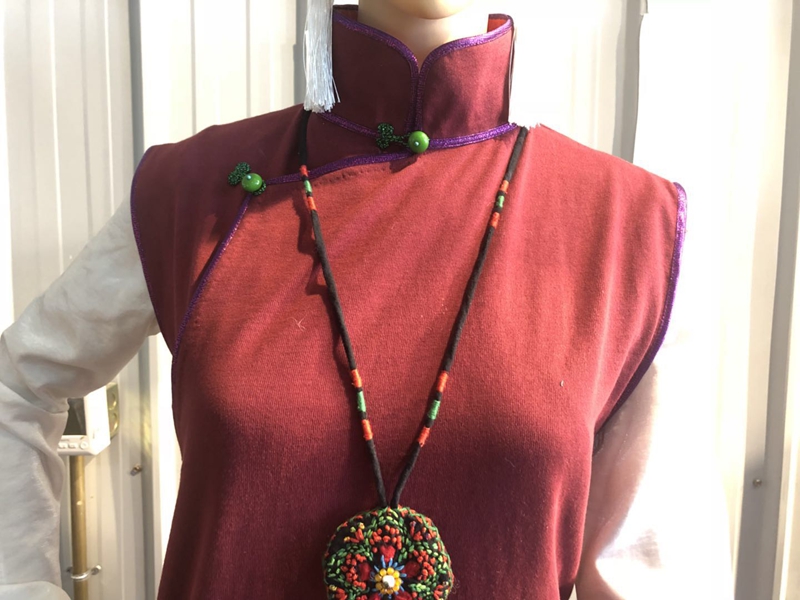 “這件衣服,我設計時結合了旗袍和藏族服飾的特征,盤扣采用了旗袍的設計,但是領邊是藏服特有的設計?!?/p>