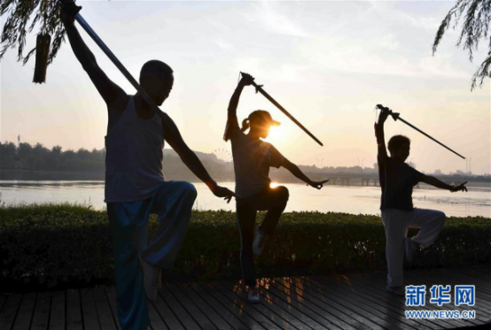 8月3日,亳州市市民在渦河公園晨練健身。盛夏時(shí)節(jié),安徽省亳州市不少市民走出家門,通過習(xí)練太極拳、太極劍等運(yùn)動(dòng)方式,享受晨練健身帶來的樂趣。 新華社發(fā)(劉勤利 攝)