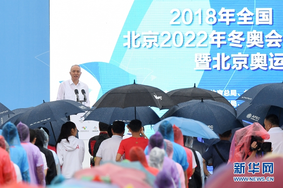 北京市委書記、北京冬奧組委主席蔡奇出席活動并宣布:“2018年全國‘全民健身日’主會場活動開始,2022年北京冬奧會和冬殘奧會吉祥物全球征集發布啟動。”