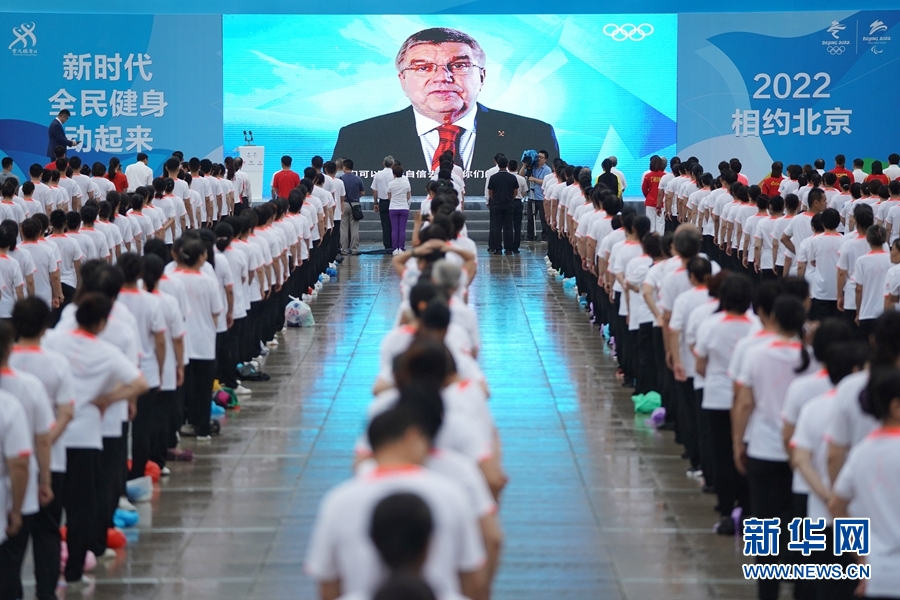 8月8日,國際奧委會主席巴赫以視頻形式通過現場大屏幕向全世界發出邀請。 新華社記者 鞠煥宗 攝