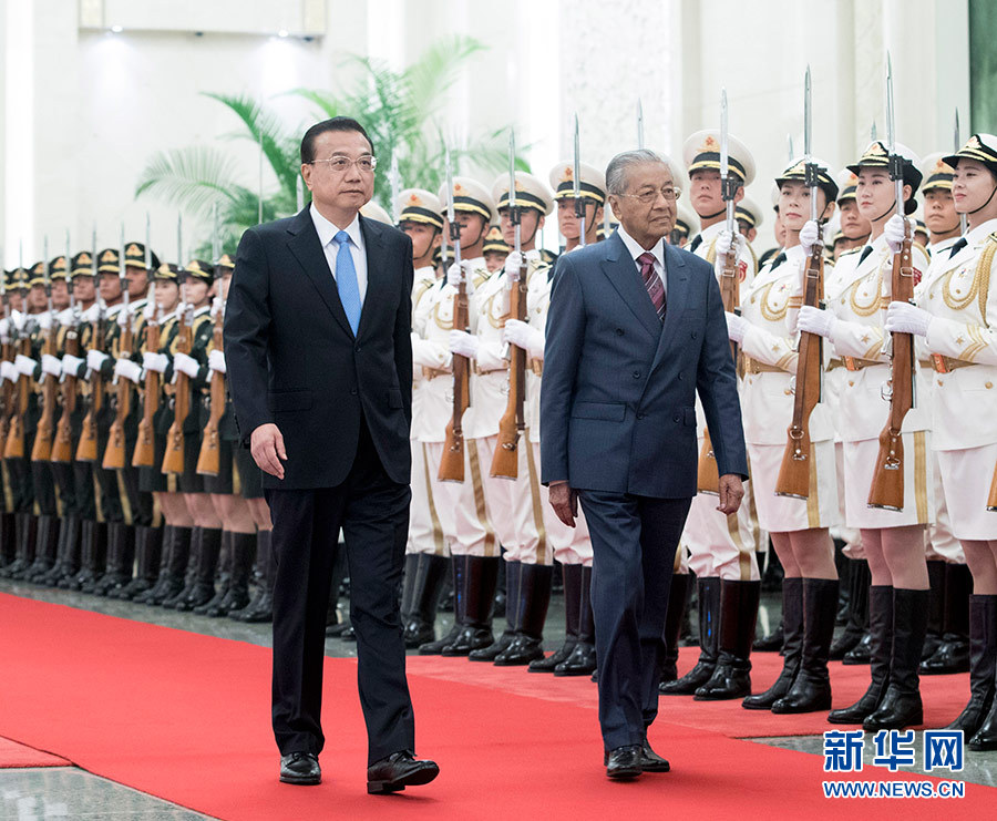 8月20日,國務院總理李克強在北京人民大會堂同來華進行正式訪問的馬來西亞總理馬哈蒂爾舉行會談。這是會談前,李克強在人民大會堂北大廳為馬哈蒂爾舉行歡迎儀式。 新華社記者 王曄 攝