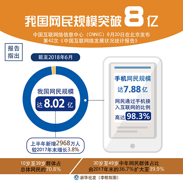 新華社北京8月20日電(記者王思北、施雨岑)中國互聯網絡信息中心(CNNIC)20日在京發布第42次《中國互聯網絡發展狀況統計報告》。報告指出,截至2018年6月,我國網民規模達8.02億,上半年新增網民2968萬人,較2017年末增長3.8%,互聯網普及率達57.7%;手機網民規模達7.88億,網民通過手機接入互聯網的比例高達98.3%。