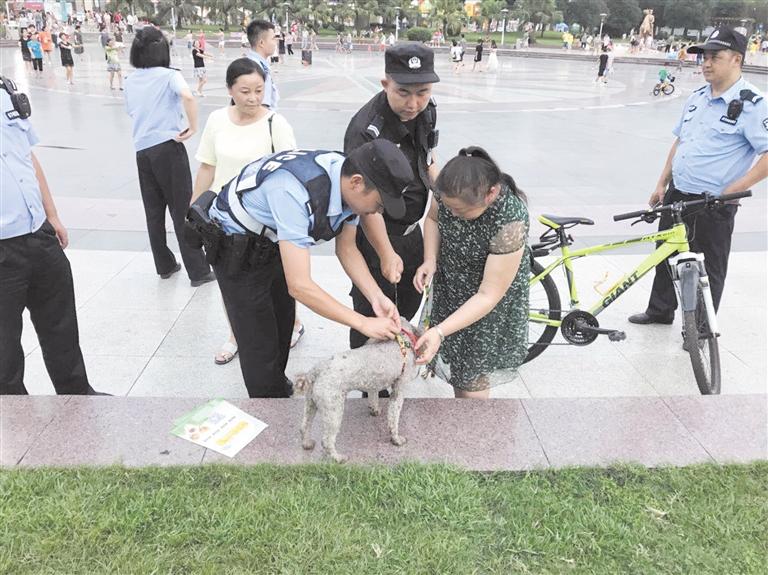 傍晚時,蒲江縣世紀廣場很是熱鬧,是市民們飯后休閑娛樂散步的集中地,其中也不乏帶著愛犬出來散步的市民。蒲江縣公安局巡防大隊民警走上街頭,現場對沒有為愛犬套上牽引繩的市民進行勸導并免費發放牽引繩。面對民警的勸導和發放牽引繩的執法方式,市民們紛紛點贊,“人性化的執法方式在宣傳文明養犬重要性的同時,也讓市民們更易接受,從實際出發緩和了矛盾,值得推廣!”