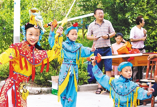 江蘇省海安市經濟技術開發區戲曲小票友在社區為居民表演京劇,豐富假日生活。 李曉亮攝
