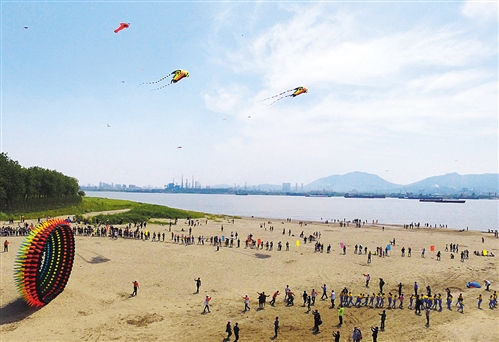 安徽省銅陵市義安區老洲鄉長江岸邊市民和游客在放風箏。近年來,銅陵市挖掘長江文化元素,打造老洲長江沙灘風箏旅游節、大通古鎮長江龍舟賽等特色長江旅游文化項目。 過仕寧攝