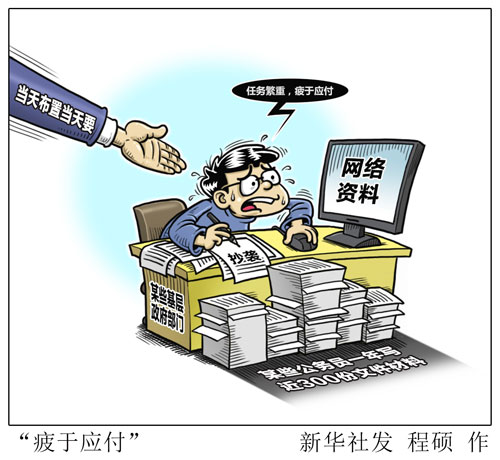 湖北省某縣委政研室干部說,一些黨員干部特別是領(lǐng)導(dǎo)干部能力不濟(jì),把發(fā)文、開會(huì)當(dāng)作抓落實(shí)的主要方式方法,甚至將其做成履職盡責(zé)、推卸責(zé)任的“痕跡”,一些文件層層轉(zhuǎn)發(fā)、照抄照轉(zhuǎn),很多時(shí)候并無新的實(shí)質(zhì)性內(nèi)容,完全是重復(fù)上級(jí)精神,造成基層干部有看不完的文件、開不完的會(huì)。