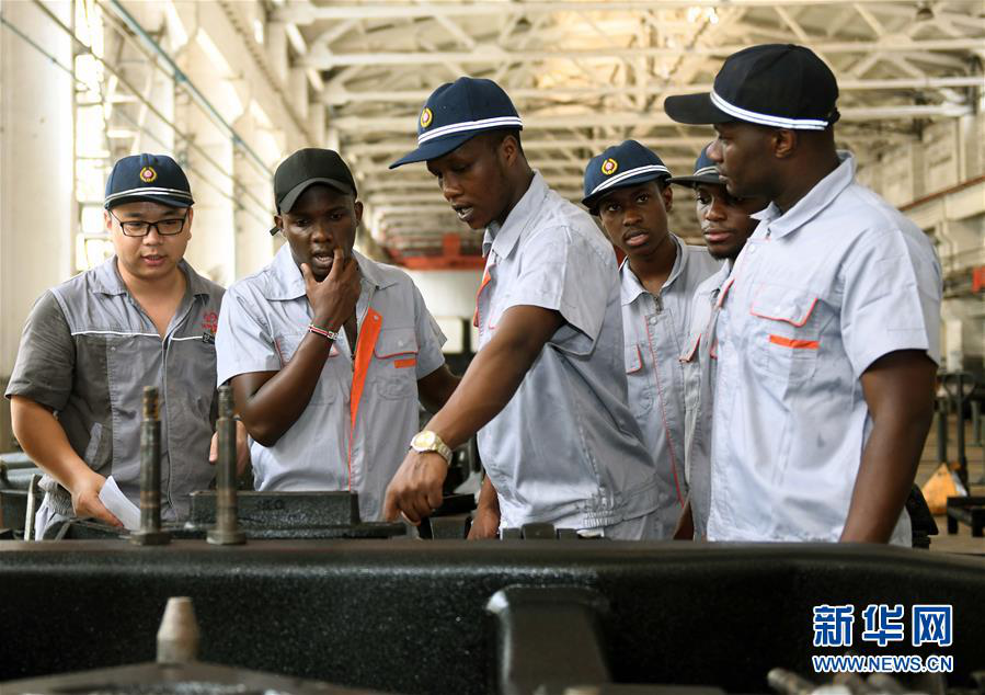 2018年7月24日,來自肯尼亞的留學(xué)生在中國鐵路濟(jì)南局集團(tuán)有限公司濟(jì)南車輛段車間聽中國工程師(左一)講解火車底盤構(gòu)造。? 新華社記者 朱崢 攝