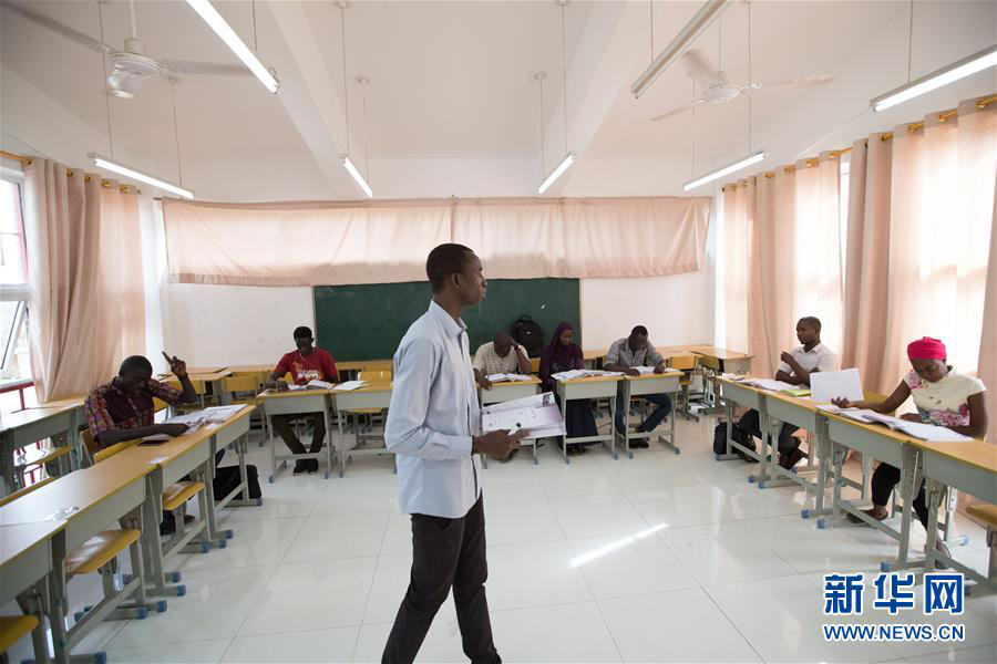 2018年7月18日,庫馬克·巴胡姆(中文名字巴虹)(前)在塞內(nèi)加爾達(dá)喀爾大學(xué)孔子學(xué)院教中文課。目前,達(dá)喀爾大學(xué)孔子學(xué)院已有3名在崗本土中文教師,他們以生動、易懂的方式在塞內(nèi)加爾傳播中國文化,講述中國故事。 新華社記者呂帥攝