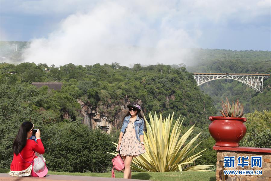2017年1月27日,在津巴布韋維多利亞瀑布城,來自中國的一對母女以遠(yuǎn)處的贊比西鐵橋?yàn)楸尘芭恼樟裟睢=陙恚汗?jié)假期期間前往非洲旅游的中國游客逐漸增多。? 新華社發(fā)(費(fèi)列蒙攝)