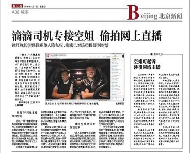 2016年,新京報(bào)曾報(bào)道過(guò)有滴滴司機(jī)在“熊貓TV”進(jìn)行邊開(kāi)車邊直播的行為。當(dāng)時(shí),這名滴滴司機(jī)在車內(nèi)安裝了一只隱藏的攝像頭,每晚11點(diǎn)左右準(zhǔn)時(shí)守候在首都機(jī)場(chǎng)外,專門接空姐訂單。而他直播的內(nèi)容,正是其在車內(nèi)與空姐聊天的過(guò)程。由于直播內(nèi)容涉嫌侵犯乘客隱私,滴滴公司已對(duì)這名司機(jī)做出了“即刻封禁”的處理,“熊貓TV”平臺(tái)也于第一時(shí)間對(duì)涉事主播做出封停處理,并對(duì)事件中的空姐表示歉意。