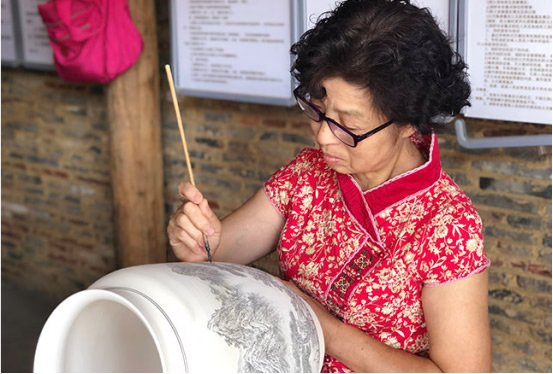省級非物質文化遺產傳承人袁寧霞在陶瓷坯體上描繪紋飾